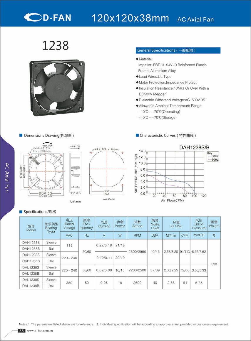 材料: 葉輪:PBT UL 94V-0增強塑料框架鋁合金 導線:UL型 電機保護:阻抗保護 絕緣電阻:1歐姆或以上,帶DC500V高阻表 介電耐壓:AC1500V 3S 允許環(huán)境溫度范圍: -10℃-+70℃(運行) -40℃-+70℃(儲存)